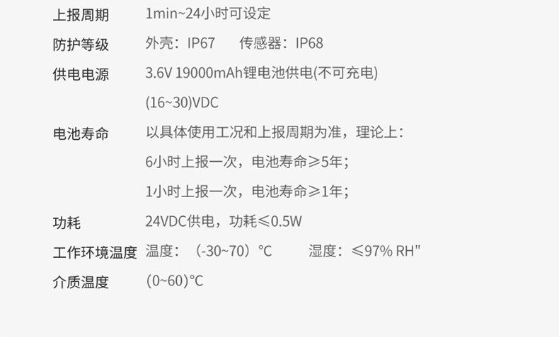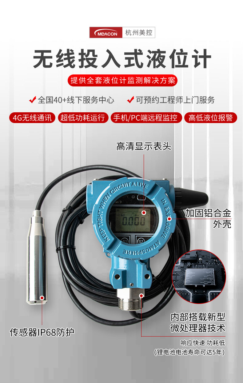 无线投入式液位计是基于4G无线通讯网络使液位的测量、变送、上报为一体的低功耗智能仪表。集成高灵敏度液位检测元件,高精度信号调理电路,低功耗电池电源管理,丰富的LCD显示界面于一体。周期性上报液位测量值、电池电量、信号质量等数据,并且能够当液位超出设置范围时及时报警,提前预警故障隐患。 本产品适合油田、水利、消防管网、自来水管网、城市供热管网等智慧城市应用场景